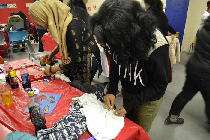 Different tables provided different uses: one table for the hot glue gun, two tables covered in pieces of fabric, two set up with stations of dye and another two set up with spray paint. Sharanjit Kaur, a junior health science major and an intern at the craft center, handed out t-shirts to the students who were arriving.